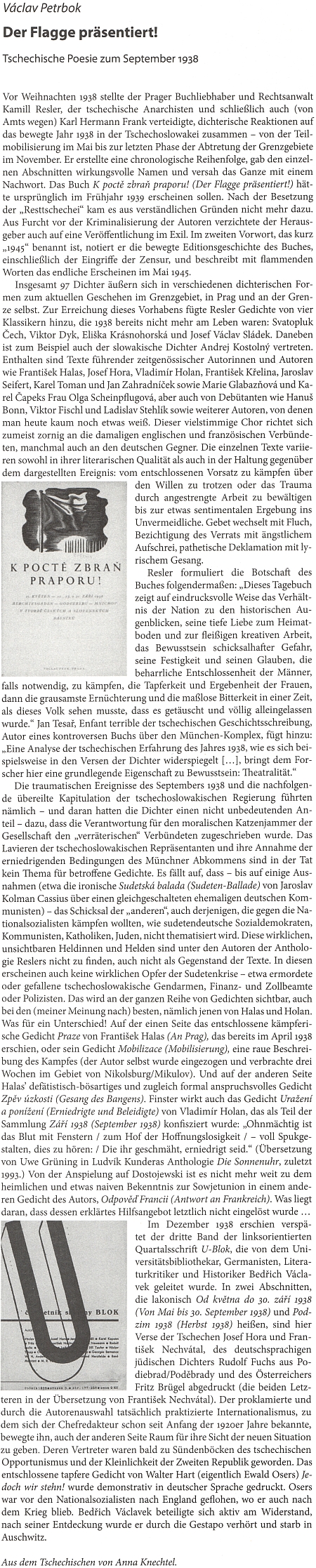 Její překlad stati Václava Petrboka o sborníku "K poctě zbraň praporu!" z roku 1945, antologie dobové české poezie k událostem roku 1938, která mohla vyjít až po válce Repro Sudetenland, 2018, č. 3, s. 326-328 |
