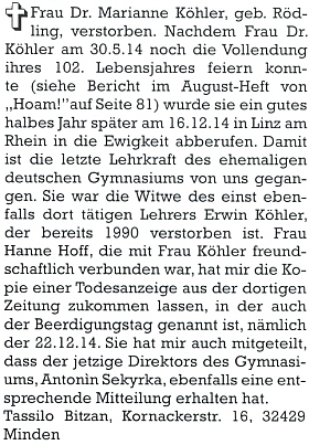 ![]() Nekrolog jejího muže, který napsal do krajanského měsíčníku Heinz Stegmann Repro Hoam!, 1990, č. 3, s. 202 |