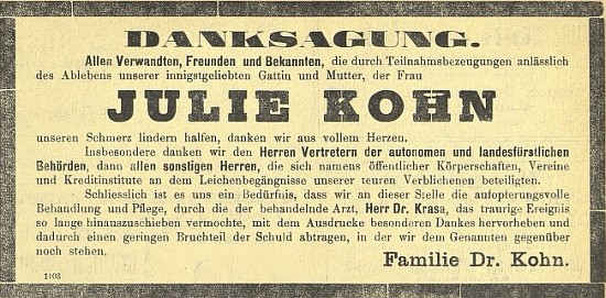 ![]() Poděkování za projevy soustrasti k úmrtí manželčinu připomíná i péči MUDr. Samuela Krasy o Kohnovu nemocnou ženu Repro Budweiser Zeitung, 1913, č. 79, s. 15 |