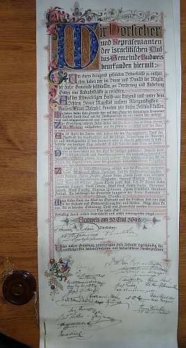 Pamětní listina českobudějovické synagogy nese vročení podle židovského kalendáře (odečteme-li od 5648 číslo 3760, dostaneme "křesťanský" letopočet 1888, kdy dokument vznikl) a také podpisy význačných osobností "rakouských" ještě Budějovic, jak patrno i z díků císaři Františku Josefovi (tubus s listinou je spolu s několika úlomky skla vlastně to jediné, co ze synagogy zůstalo, (viz i Peter Becher, Max Fleischer a Jakob Fried) Repro ze sbírek Jihočeského muza v Českých Budějovicích, výstava Zmizelé a nalézané osudy (Střední škola obchodu, |