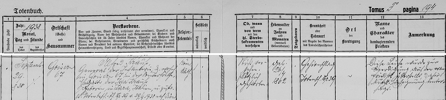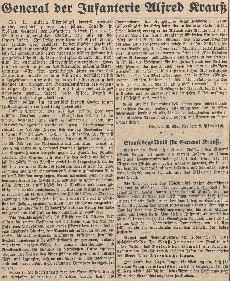 Nekrolog ve vídeňských novinách Repro Neues Wiener Tagblatt, 30. 9. 1938, s. 10 (ANNO - AustriaN Newspapers Online) |