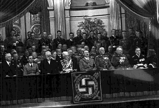 ![]() Na oslavě zvané \Heldengedenktag" (Památka hrdinů) v berlínské Státní opeře roku 1937, zleva Neurath, Goebbels, Krauss, von Mackensen, Hitler, von Blomberg, von Fritsch a Raeder Repro ze sbírek Österreichische Nationalbibliothek |