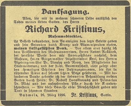 ![]() Poděkování za projevy soustrasti a doprovod na poslední cestě Repro Budweiser Zeitung, 1926, č. 25, s. 16 |