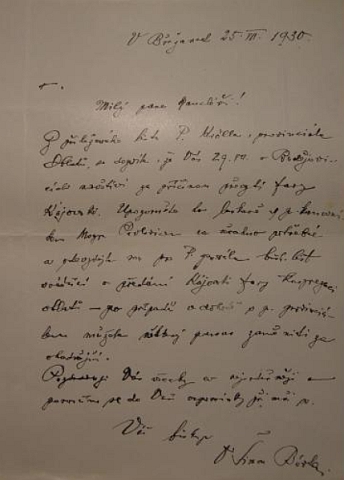 ![]() Jeho dopis z června 1930, adresovaný českobudějovickému biskupství, se žádostí o souhlas s převzetím poutního místa Kájov do užívání oblátů Repro J. Růžičková, Historie oblátů v českých zemích od roku 1911-1950 (bakalářská práce 2011) |