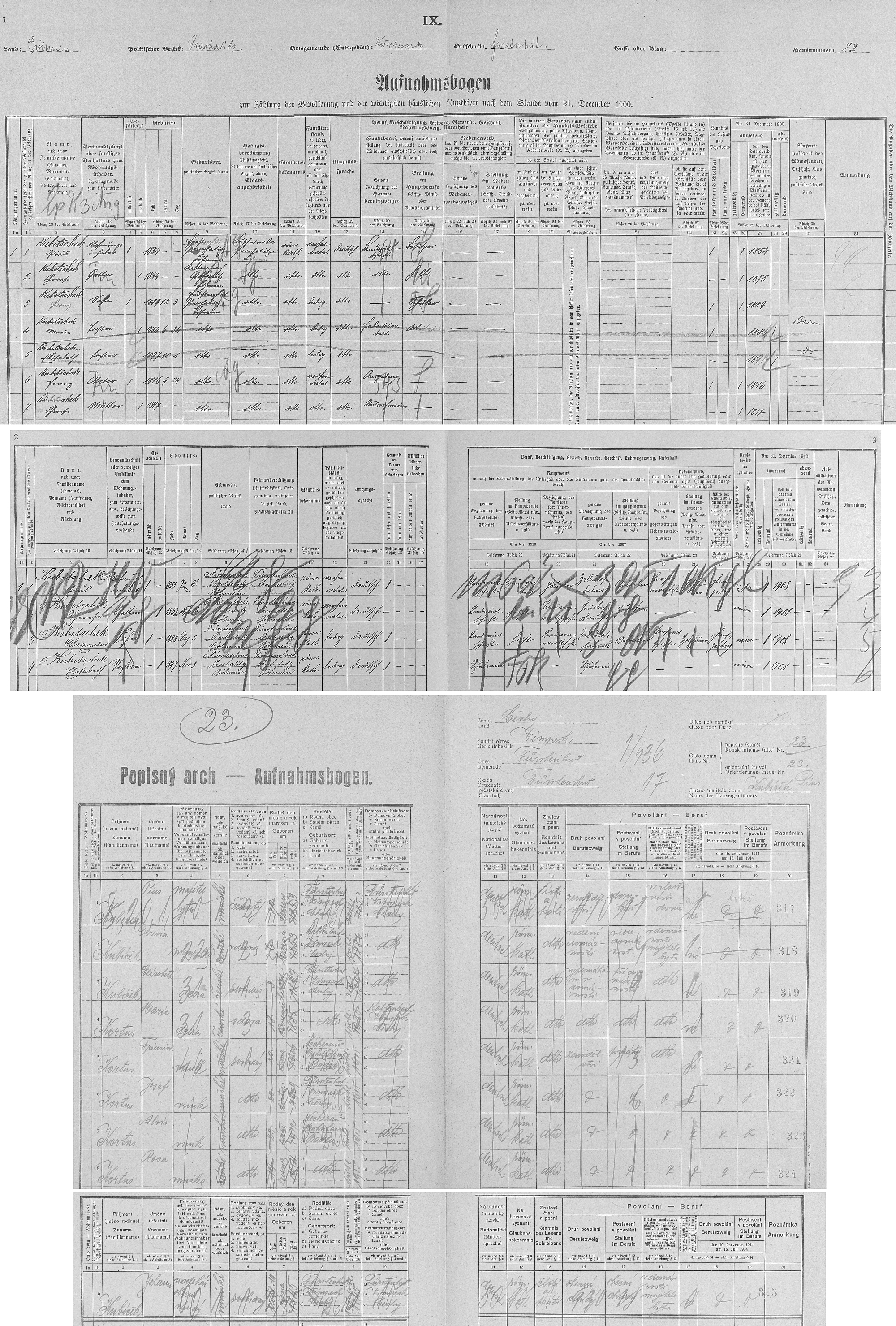 Tři (vlastně čtyři) archy sčítání lidu z let 1900, 1910 a 1921 pro stavení čp. 23 v Knížecích Pláních, kde stojí za povšimnutí nejen mnohé rozdíly v uvedených datech narození jednotlivých osob, ale i na tom z roku 1921 pobyt už ovdovělé dcery Marie se 4 Piovými vnuky a navíc ještě obecního chudého, "nocleháře" Johanna Kubíčka pod střechou nevelkého stavení Repro Sčítání lidu 1910 a 1921, Knížecí Pláně, SOkA Prachatice (SOA v Třeboni - digitální archív) |