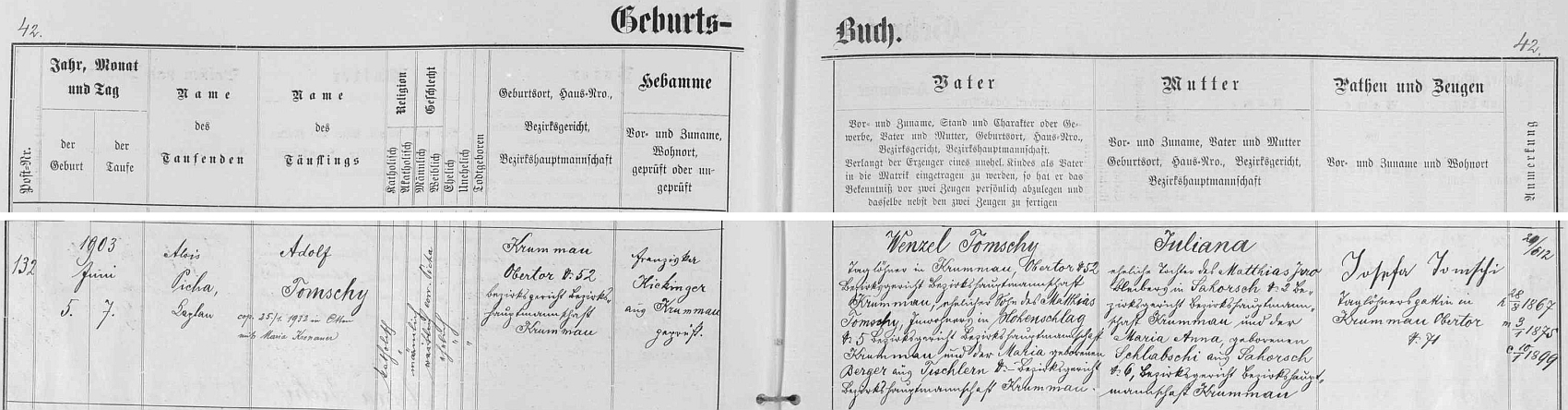 Záznam českokrumlovské křestní matriky o narození otcově Repro SOA v Třeboni - digitální archív |