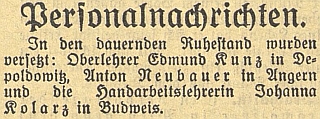Zpráva o odchodu do důchodu a zápis o tom v obecní kronice, vedené Martinem Lankusem, díky níž víme, kam se odstěhoval Repro Budweiser Zeitung, 1932, č. 80, s. 10 a archív Obecního úřadu v Dešenicích |