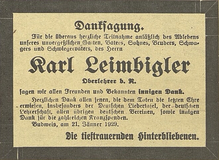 ![]() Poděkování rodiny za projevy soustrasti po jeho úmrtí Repro Budweiser Zeitung, 1929, č. 6, s. 8 |
