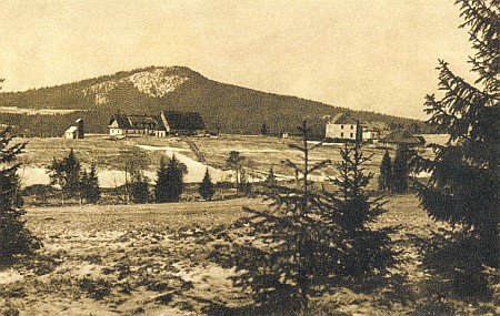 ![]() Pohled od zaniklého Zhůří na dvojvrchol Roklanu Repro J. Kavale - B. Bisinger, Příběhy potoků a řek Šumavy (2015), s. 15 |