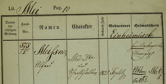 ![]() Pražská policejní přihláška jeho otce Eduarda Meissnera (1785-1868), rodáka z Drážďan, jeho manželky Karoliny (*1790 ve Skotsku) a syna Alfreda Repro Národní archiv, Policejní ředitelství I, konskripce, karton 365, obraz 602 |