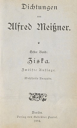 ![]() Titulní list (1864) českého překladu jeho Žižky, který pořídil Ervín Špindler, mj. i překladatel původně německy psaných libret Smetanových oper Dalibor a Libuše od Josefa Wenziga |