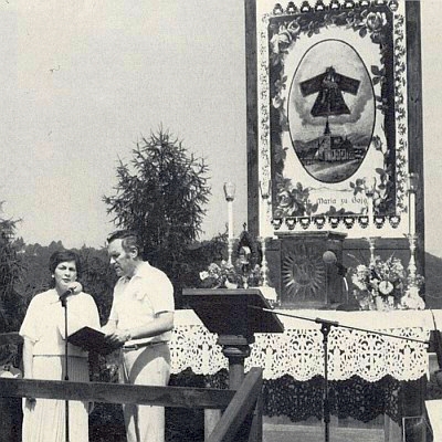 ![]() Na louce nad pasovským poutním kostelem Panny Marie zpívají před oltářem s obrazem Madony Kájovské mariánskou poutní píseň "Es blüht der Blumen eine auf ewig grüner Au..." Repro Glaube und Heimat, 1985, č. 9/10, s. 19 |