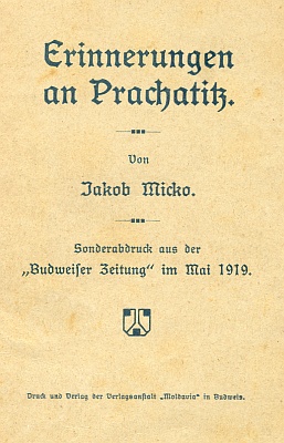 ![]() Obálka (1919) zvláštního otisku jeho vzpomínek na Prachatice, jak vycházely předtím na stránkách Budweiser Zeitung |