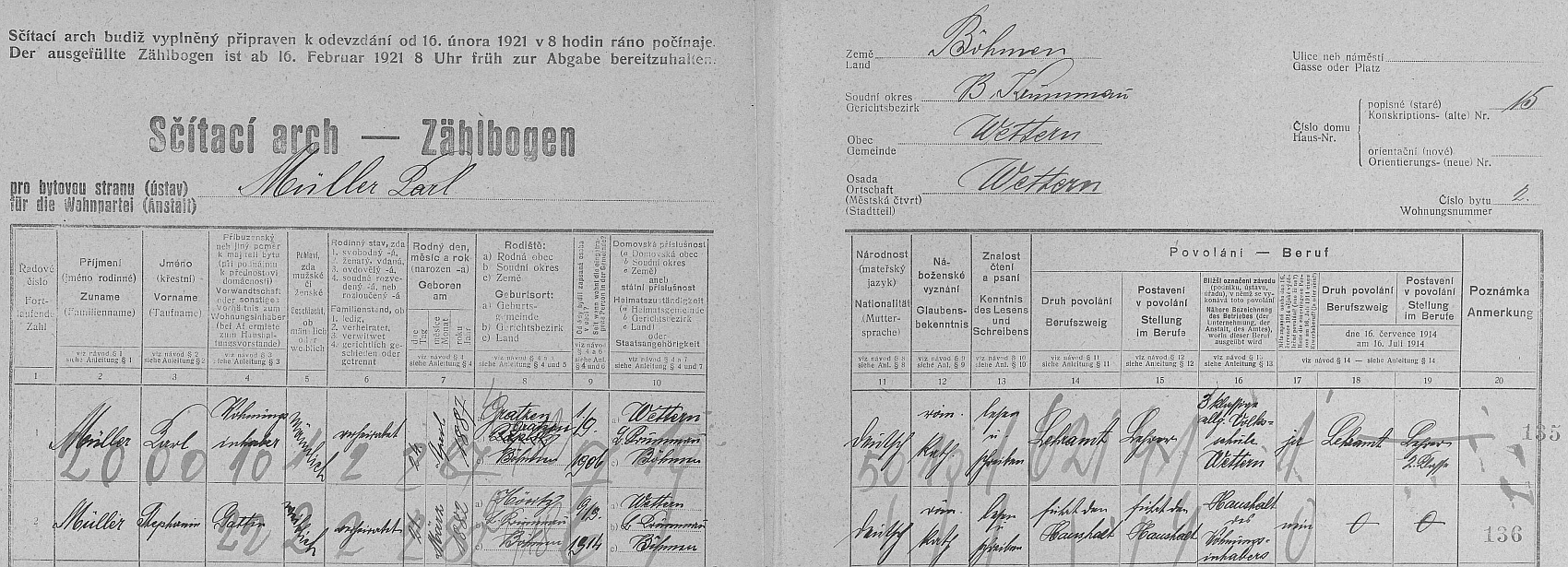 Arch sčítání lidu z roku 1921 pro byt č. 2 ve stavení čp. 15 ve Větřní Repro Sčítání lidu 1921, Želnava, SOkA Český Krumlov (SOA v Třeboni - digitální archív) |