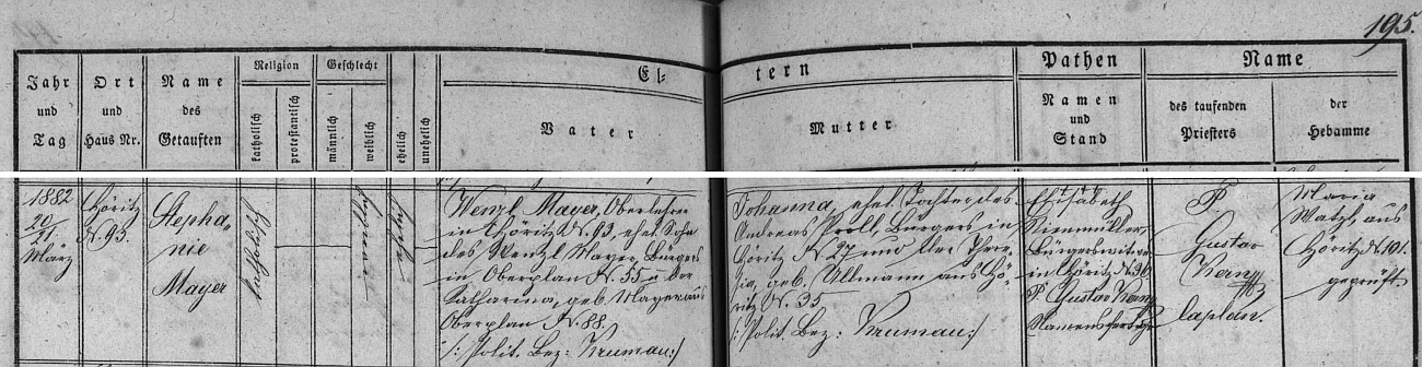 Záznam o narození manželčině v hořické křestní matrice Repro SOA v Třeboni - digitální archív |