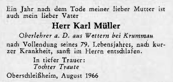 ![]() Blahopřání k jeho sedmdesátinám bylo hlavní zprávou z Větřní v červnovém čísle krajanského časopisu v roce 1957 Repro Glaube und Heimat, 1957, č. 6, s. 256-257 |