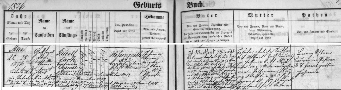 Záznam křestní matriky pro Horní Planou o narození jeho otce Rudolfa, narozeného 28. května 1876 v Jenišově (Hossenreith) čp. 2 svoborné matce Josefě Zachové a "legitimizovaného" příjmením Münd až prohlášením otcovství Matthiasem Mündlem roku 1877 Repro SOA v Třeboni - digitální archív |