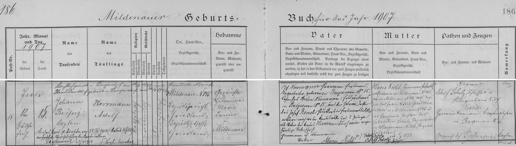 Záznam o jeho narození v "mildenavské" křestní matrice, z něhož se dovídáme, že přišel na svět jako nemanželské dítě Marie Nichtové (*18. března 1888 v Mildenavě čp. 145), dělnice přádelny v Mildenavě, katolické dcery Franze Nichta, továrního dělníka z Mildenavy čp. 145, a Karoliny, dcery Ferdinanda Scholze, nádeníka z Raspenavy čp. 202 - "legitimizován" byl pak až skoro tříletý matčiným sňatkem 23. dubna roku 1910 s Hermannem Ferdinandem Neumannem (*25. března 1885 v Raspenavě čp. 15), nádeníkem z Raspenavy čp. 15 (synem Antona Neumanna, zahradníka /Feldgärtner/ z Raspenavy čp. 15, a Helene, dcery Josefa Ressela, chalupníka ve Ferdinandově /Ferdinandstal/ čp. 20), který se tu v křestní matrice za otce na vlastnoručním přípise prohlašuje před matkou dítěte a dvěma svědky |
