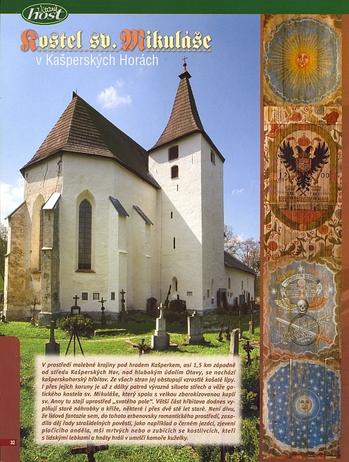 Úvod textu o hřbitovním kostele sv. Mikuláše v Kašperských Horách i s detaily Repro Vítaný host na Šumavě a v Českém lese, jaro 01/2008, s. 32 |