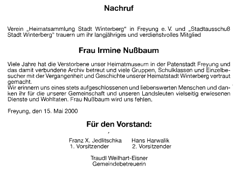 ![]() Parte s podpisy Franze X. Jedlitschky a Hanse Harwalika Repro Böhmerwäldler Heimatbrief, 2000, č. 7, s. 335 |