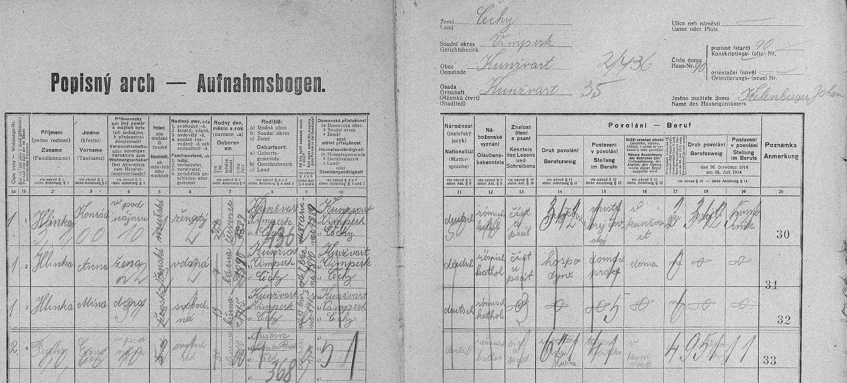 Arch sčítání lidu z roku 1921 kunžvartský dům čp. 90 Repro Sčítání lidu 1921, Strážný, SOkA Prachatice (SOA v Třeboni - digitální archív) |