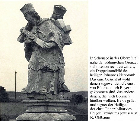 ![]() S jeho textem je na obálce krajanského měsíčníku zachycen "dvojitý Nepomuk" při české hranici v bavorském městečku Schönsee (viz i Alfred Görgl) Repro Glaube und Heimat, 1981, č. 5, obálka |