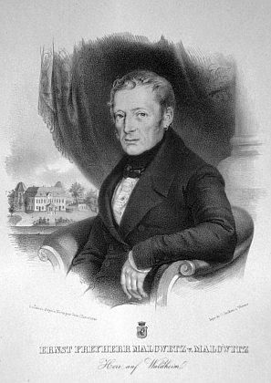 ![]() Na portrétu Ernsta von Malowetz je vidět v pozadí zámek ve dnes zaniklém Zahájí Repro Wikipedia |