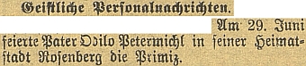 ![]() Zpráva o jeho primici v českobudějovickém německém listu Repro Budweiser Zeitung, 1919, č. 51, s. 6 |