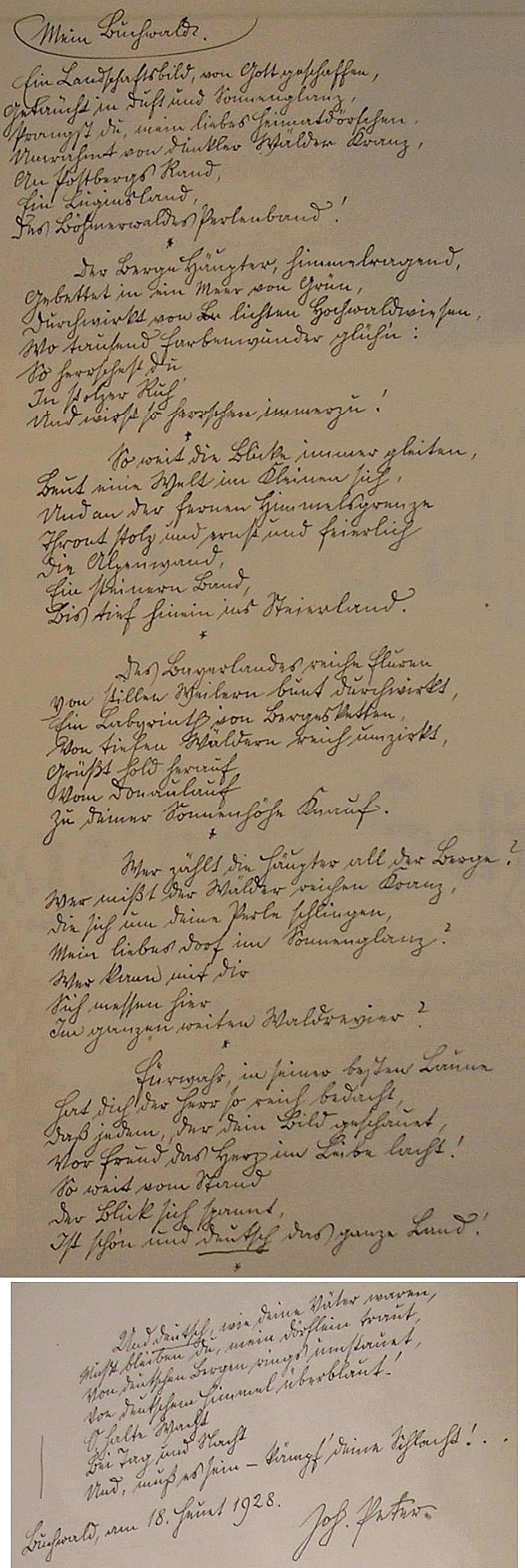 Jeho vlastní rukou psaná báseň "Má Bučina" v kronice rodné obce Repro Bučina (Gemeinde Gedenkbuch), SOkA Prachatice (SOA v Třeboni - digitální archív) |