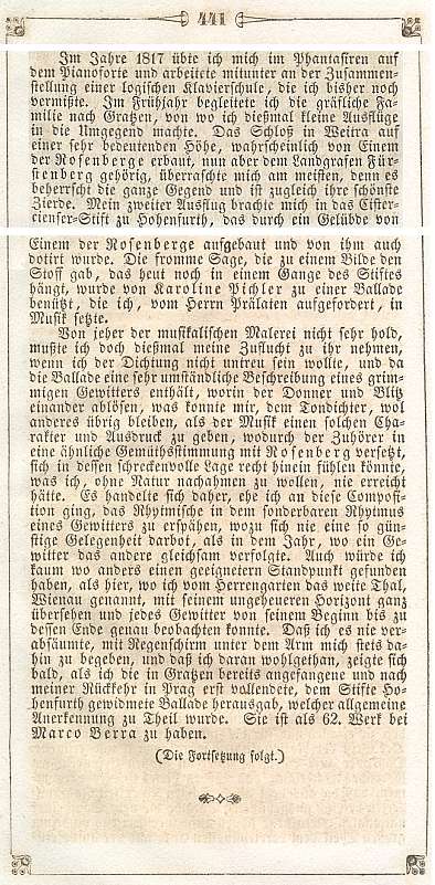 Václav Jan Tomášek (Tomaschek) líčí ve svém vlastním životopise, jak zhudebnil "baladu" Karoline Pichlerové o založení Vyššího Brodu Repro Libussa, 1847, s. 440-441 |
