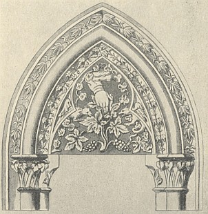Tympanon ve vyšebrodském klášteře na staré kresbě a dnes (viz i Bernhard Grueber) Repro Glaube und Heimat, 1966, s. 840 |