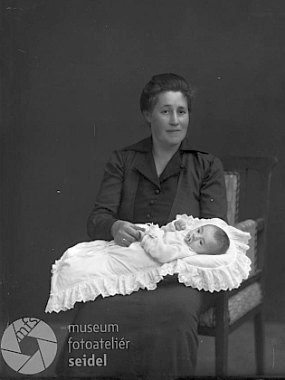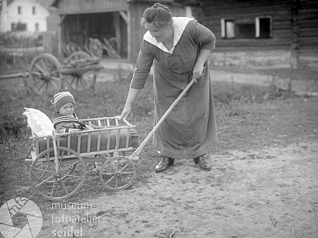 Jeho žena Brigitte s nejmladším synem Antonem v povijanu na snímku ze září 1919 a v červnu 1920 v "šumavském kočárku" |
