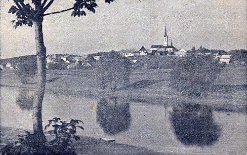 ![]() Stará pohlednice nahlíží městečko nad řekou Vltavou shora |