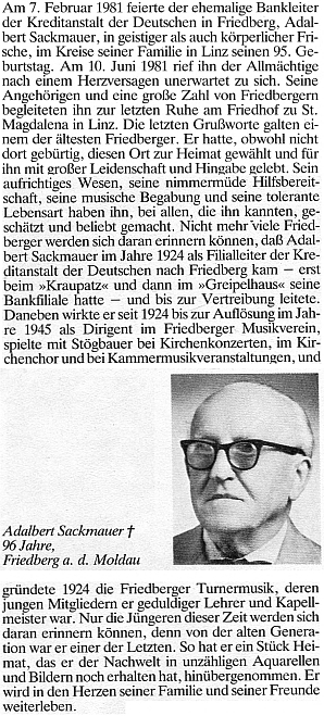 Nekrolog vedoucího frymburské filiálky bankovní instituce Kreditanstalt der Deutschen Adalberta Sackmauera, autora obálky k její knize a otce Othmara Sackmauera, ve Frymburku narozeného, jenž její knihu ilustroval Repro Glaube und Heimat, 1981, č. 12, s. 41 |
