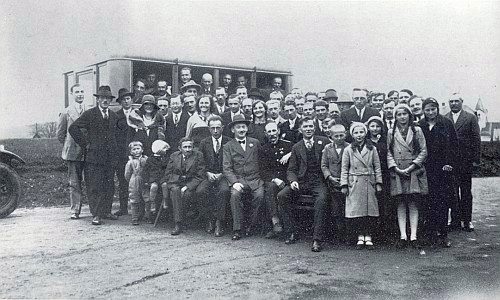 ![]() Zakládající schůze místní organizace německé křesťansko-sociální strany se konala v Randakově hostinci a její účastníci se před ním dali vyfotografovat Repro Kaltenbach - Heimat im Böhmerwald (1980), s. 168 |
