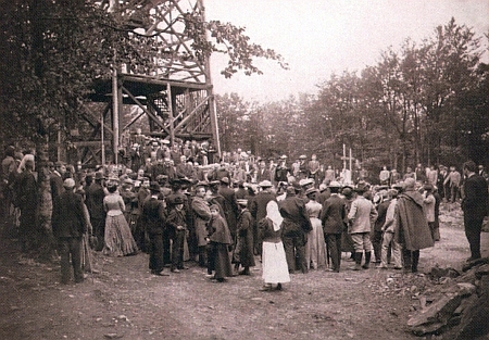 Stavba dřevěné rozhledny na Čerchově v roce 1894 Repro K. Pinkrová - L. Ptáček, Pozor, hranice! : průvodce historií česko-bavorského pohraničí okresů Domažlice a Cham (2020), s. 141 |