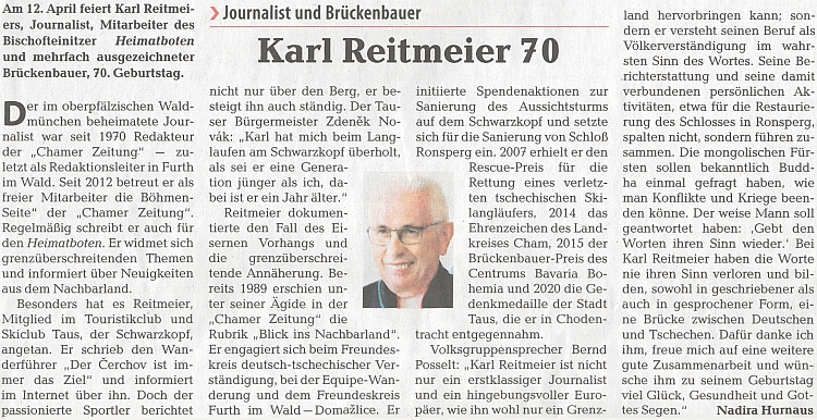 ![]() Pozdrav k jeho sedmdesátinám na stránkách ústředního krajanského listu Repro Sudetendeutsche Zeitung, 2021, č. 12-13, s. 18 |