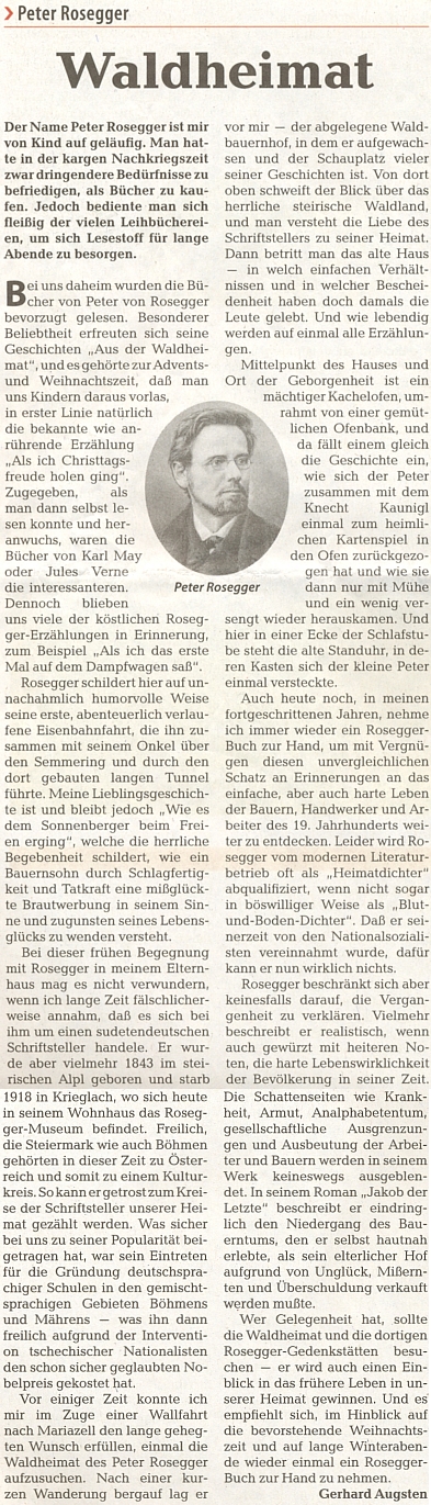 ![]() Podle této noticky Waltera Franze v krajanském časopisu zabránil udělení Nobelovy ceny za literaturu roce 1913 právě Roseggerovi protest "českých nacionalistů", kteří jako důvod uvedli dvoumilionovou podporu německým školám na jazykové hranici, výsledek sbírky, k níž dal popud už roku 1909 Roseggerův časopis Heimgarten Repro Hoam!, 1993, s. 340 |