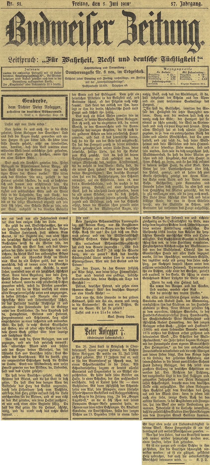Pohřební proslov na titulní straně českobudějovického německého listu, pokračující Roseggerovým životopisem na dalších stranách, obojí z pera Karla Franze Leppy Repro Budweiser Zeitung, 1918, č. 51, s. 1-3 |