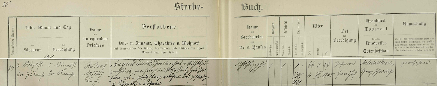 ![]() Záznam postoloprtské křestní matriky o jeho zdejším narození rodičům Augustu a Marii Saitzovým dne 4. dubna roku 1845 v domě čp. 61 |