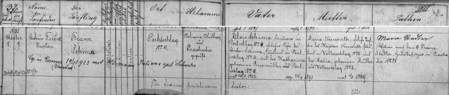 Záznam o jeho narození v prachatické křestní matrice s pozdějším přípisem o jeho svatbě 19. května roku 1923 ve štýrském městě Eisenerz s Julianou Hörmannovou, roz. Schusterovou Repro SOA v Třeboni - digitální archív |