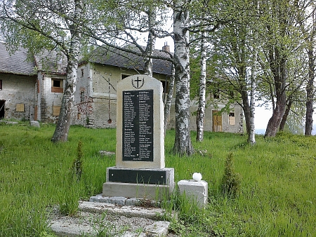 Památník padlým za 1. světové války z obcí Nová Pec, Nové Domky, Jelení Vrchy, Dlouhý Bor a Láz před někdejším hostincem v Nové Peci (Láz) v původní podobě na pohlednici Johanna Mayera a na snímku z roku 2014 Repro M. Leiš, Konec staré Šumavy (2020), s. 168 a foto Pavel Polák |