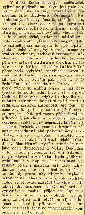 Také Jihočeské listy si na Schreinerův kaplický projev "v době česko-německých smiřovaček", jak píší, přisadily svou Repro Jihočeské listy, 1912, č. 90, s. 2 |