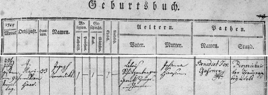 Záznam o jeho narození v křestní matrice steyrské městské fary Repro Matricula Online |