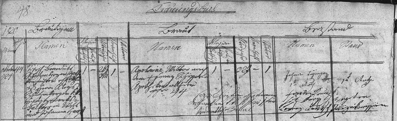 Záznam o první svatbě v kaplické oddací matrice Repro SOA v Třeboni - digitální archív |