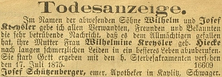 ![]() Oznámení o úmrtí druhé manželky v pražských novinách Repro Prager Abendblatt, 26. 7. 1875, s. (4) (ANNO - AustriaN Newspapers Online) |