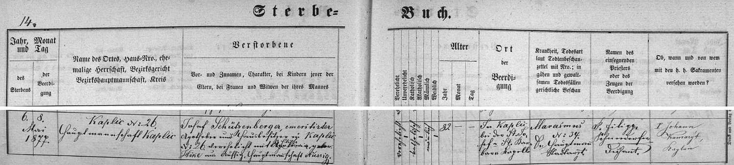Záznam o úmrtí v kaplické knize zemřelých Repro SOA v Třeboni - digitální archív |