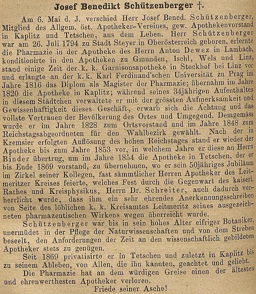 ![]() Oznámení o úmrtí druhé manželky v pražských novinách Repro Österreichische Zeitschrift für Pharmacie, 1877, č. 15, s. 252 (ANNO - AustriaN Newspapers Online) |
