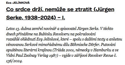 Jürgen Serke se narodil podle vlastních slov dne 19. dubna roku 1938 ve městě Landsberg an der Warthe, které dnes na severozápadě Polska (Lubušsko /Ziemia Lubuska/) nese jméno Gorzów Wielkopolski. Adresa rodného domu zněla tehdy Caprivi-Straße čp.1 podle nástupce Otty von Bismarcka ve funkci německého kancléře, jímž se stal Georg Leo hrabě von Caprivi de Caprera de Montecuccoli (1831-1899). Dnes se ovšem ulice jmenuje jinak a z evangelického hřbitova ve dnes zásluhou Poláků převážně katolickém městě je po "terénní úpravě" travnatý park. On sám je svými osudy a zájmy živým svědectvím toho, že "Evropa zemřela v Praze" (rozuměj mnichovskou "dohodou", ustupující tehdy Hitlerově "nové Evropě"), jak nazval úvodní kapitolu své nejznámější knihy "Böhmische Dörfer" (napsal ji podle vlastního vyjádření po rozhovorech s Milanem Kunderou a s Jiřím Grušou /ten má i samostatné zastoupení na webových stránkách Kohoutího kříže) roku 2017 byla přeložena i do japonštiny), z níž používáme i český překlad naší textové ukázky. Jürgenovi rodiče se brali v roce 1935, otec zemřel roku 1963, matka v roce 1979. Otec byl už před válkou v NSDAP. Řeka Warta je pravým přítokem Odry a sotva kdo tušil z obyvatel Landsbergu něco o tom, že Stalin z Odry a Nisy utvoří německou hranici a z východu Polska sem přijdou statisíce nových "slovanských" obyvatel, náhradou za Němce a Židy, kteří se stali obětí šilené Hitlerovy rasové politiky v letech jeho vlády. Obětí vyhnání z rodného města se stal tehdy sedmiletý chlapec s babičkou, matkou a sestrou (otec byl v anglickém zajetí) už roku 1945, konce války se dočkal v Berlíně, Vyrůstal nedaleko Hamburku, pak v Trieru, po maturitě se stal žurnalistou. V letech 1961-1969 pracoval v americké zpravodajské agentuře United Press International (UPI) ve Frankfurtu nad Mohanem, nakonec jako hlavní reportér. V letech 1967-1968 informoval z Československa o "pražském jaru". V hamburském levicovém magazinu "Stern" (v jeho redakci bychom našli v sedmdesátých letech minulého století i českobudějovického rodáka Jiřího Žáka /1917-1986/, zemřel v Hamburku) pracoval Serke až do roku 1983, psal mj. o hnutí Charta 77 a po převratu 1989 byl dokonce nějaký čas "bodyguardem" Václava Havla. Psal pak pro listy "Die Weltwoche" a "Die Welt". V roce 2002 získal český překlad jeho knihy "Böhmische Dörfer", z níž i Kohoutí kříž načerpal množství informací, ocenění "Magnesia Litera" a roku 2017 obdržel její autor z rukou českého ministra zahraničí cenu "Gratias agit" za šíření dobrého jména Česka ve světě. Žil a psal v obci Großhansdorf blízko Hamburku a zemřel tam někde 13. dubna 2024. Záleží na tom místě mezi tolika (patří mezi ně i zaniklý dnes šumavský Josefodol a blízká Zvonková téhož osudu), o nichž zanechal literární svědectví?