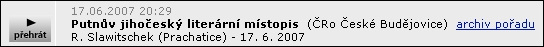 ![]() Martin C. Putna pojednává ve svém Jihočeském literárním místopisu na vlnách českobudějovického rozhlasu o zamilované knize svého dětství a o jejím autorovi (klikněte pro přehrání) Repro www stránky Českého rozhlasu |